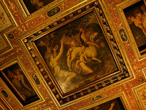 Cosimo I. ließ die Decke des Saales der Fünfhundert um sieben Meter erhöhen und mit Fresken von Vincenzo Borghini verschönern – Von diesem Maler stammen auch die Wandgemälde. Die Bilder symbolisieren die unter Cosimo I. in Italien erreichte Vorherrschaft von Florenz und der Toskana.